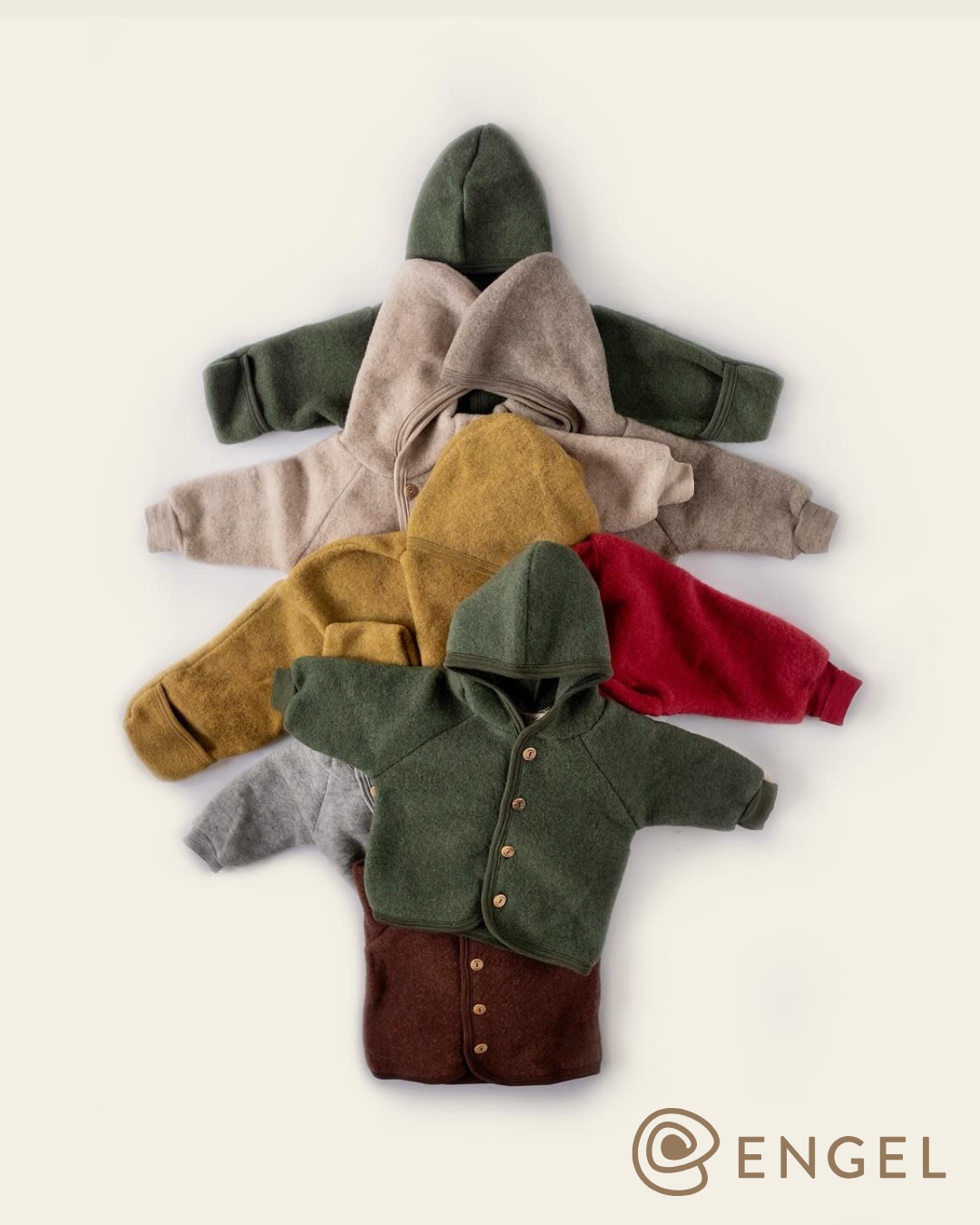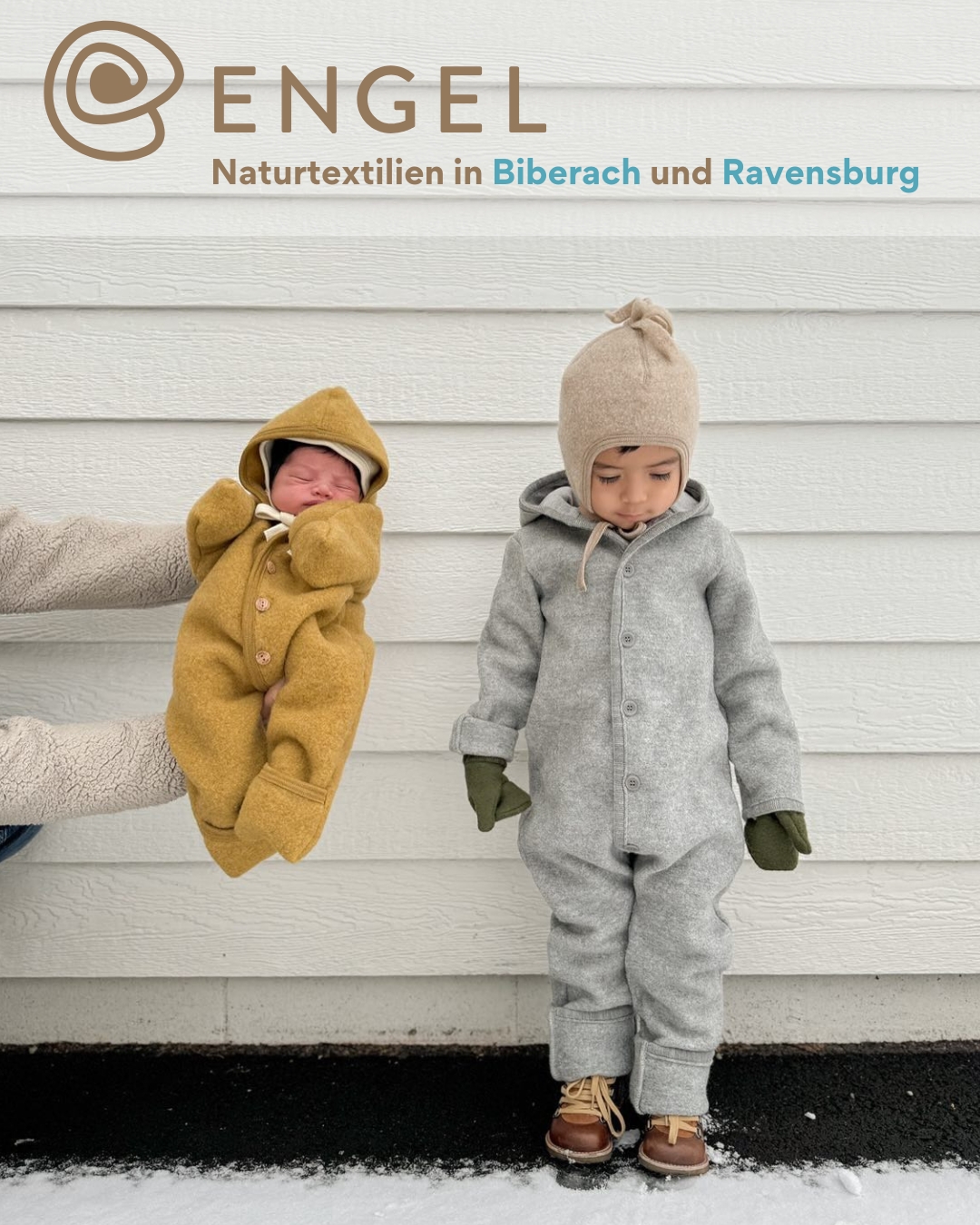 Naturtextilien von ENGEL - Jacken, Overalls, Bodies, Zweiteiler, Mützen und Handschuhe der aktuellen Kollektion jetzt bei uns in Biberach (Bürgerturmstraße) und Ravensburg (Adlerstraße) in den Größen 50/56 bis 86/92. Die Merinoschurwolle/Seide-Mischungen regulieren Wärme und Feuchtigkeit ideal, sorgen für ein gesundes Hautklima und werden von der Firma Engel nach höchsten ökologischen und sozialen Standards in Deutschland hergestellt.